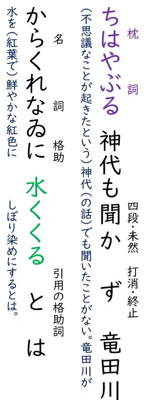 訳:(不思議なことが起きたという)神代(の話)でも聞いたことがない。竜田川が水を(紅葉で)鮮やかな紅色にしぼり染めにするとは。
