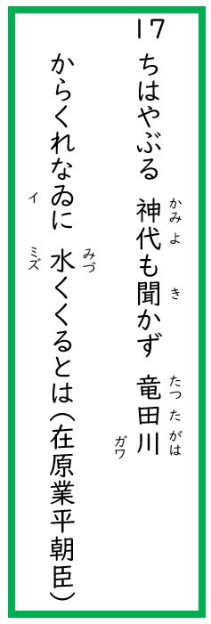 17 ちはやぶる▢代も聞かず竜田川からくれなゐに水くくるとは(在原業平朝臣)