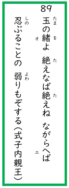 89 玉の緒よ絶えなば絶えねながらへば忍ぶることの弱りもぞする(式子内親王)